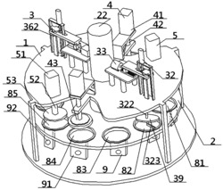 一种多层结构类工具的轮盘式制造系统,包括上下平行设置的固定平盘、转动平盘,以及定位指示/颗粒添加/加热凝结/加压成型/底层衬板添加/顶层衬板添加共六种装置,转动平盘上设置的与各装置对应的凹槽的底部与定位指示装置中的外壳体相连接,凹槽的顶部设置有与颗粒添加装置中定位卡块进行卡接配合的定位卡口,凹槽上近外壳体处设置有一、二号导电片,一号导电片的底部依次经一号导电线、电源盒、中导电线、定位指示灯、二号导电线后与二号导电片的底部进行电路连接,一、二号导电片的侧部之间夹成有与导电柱进行插入配合的导电插槽。本设计不仅工作效率较高,精确度较强,安全性较高,而且产品质量较好,易操作与维护,稳定性较高。