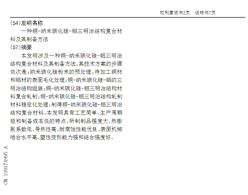 本发明涉及一种铜‑纳米碳化硅‑铝三明治结构复合材料及其制备方法。其技术方案的步骤依次是:纳米碳化硅粉末的预处理;待加工铜材和铝材的表面毛化处理;铜‑纳米碳化硅‑铝的三明治结构组装;铜‑纳米碳化硅‑铝三明治结构材料复合轧制;铜‑纳米碳化硅‑铝三明治结构轧制材料稳定化处理;制得铜‑纳米碳化硅‑铝三明治结构复合材料。本发明具有工艺简单、生产周期短和制备成本低的特点,所制制品强度大、热膨胀系数低、导热性高、耐腐蚀性能优良、表面机械啮合水平高、塑性变形能力强和结合强度好。