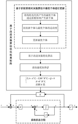 本发明涉及一种改进LQR的船用起重机控制方法,旨在解决传统LQR因不易选取最佳权重矩阵而导致船用起重机作业时减摆效果不佳、响应速度慢的问题,具体步骤如下:首先构建船用起重机负载摆角的动力学模型,将此动力学模型经过线性化处理转化为状态空间方程,然后利用LQR控制方法将负载摆角问题转化为二次型性能指标中权重矩阵参数的优化整定问题,最后基于折射原理改变群体中最优个体的更新机制来改进灰狼优化算法(GWO),用于整定LQR控制器最优权重矩阵,从而获得系统最优性能指标。本发明提高了权重矩阵参数的适应性,对负载的摆角抑制效果好,响应速度快,有效地提高船用起重机吊装作业的工作效率。