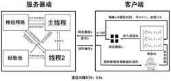 本发明公开了一种考虑海浪干扰的无人艇回收分布式决策仿真系统,完成海洋作业中母船对无人艇的自动回收任务。首先,搭建无人艇回收任务所需的仿真环境;基于DuelingNetwork算法设计决策模块,并针对应用场景优化神经网络结构,使决策模块具有短时记忆功能;实现分布式通信机制,将决策模块置于服务器端,环境模块置于客户端;最后,启动服务器与客户端程序,控制无人艇抽象的智能体完成回收任务。该系统针对实际复杂海况,设计模拟物理交互的仿真环境;采用深度强化学习算法,使得AI控制器应对复杂场景时,具有更强的鲁棒性,且让模型具有迁移学习能力;分布式通信机制将训练与控制独立运行,便于实现离线训练,同时可以实现远程控制效果。