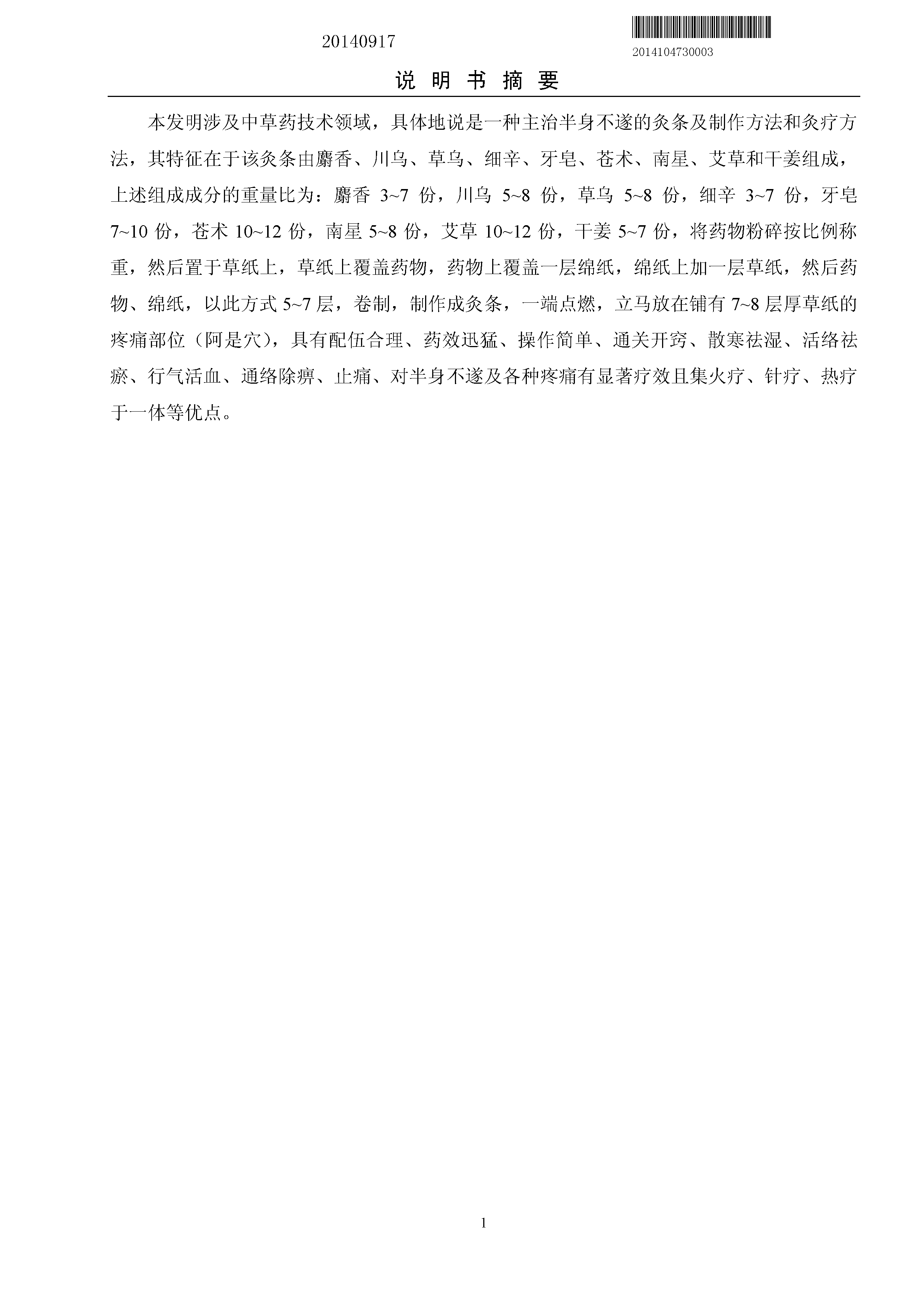 一种主治半身不遂的灸条及制作方法和灸疗方法