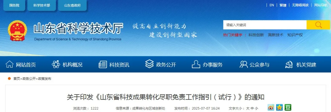关于印发《山东省科技成果转化尽职免责工作指引(试行)》的通知
