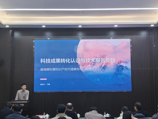 威海惠和惠知识产权代理事务所丁毅副主任结合实操案例,分享了专利技术服务在成果转化中的支撑作用以及专利保护对科技成果转化的助推作用。