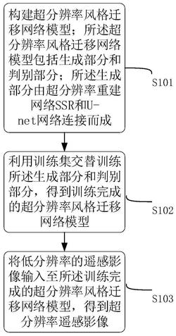 本发明公开了基于超分辨率风格迁移网络的遥感影像超分辨率重建方法,包括以下步骤:构建超分辨率风格迁移网络模型;所述超分辨率风格迁移网络模型包括生成部分和判别部分;所述生成部分由超分辨率重建网络SSR和U‑net网络连接而成;利用训练集交替训练所述生成部分和判别部分,得到训练完成的超分辨率风格迁移网络模型;将低分辨率的遥感影像输入至所述训练完成的超分辨率风格迁移网络模型,得到超分辨率遥感影像。本发明克服了传统超分辨率网络模型泛化能力差和重建影像纹理细节丢失等缺点,能够生成清晰度和纹理特征更加接近真实高分辨率遥感图像的重建影像。