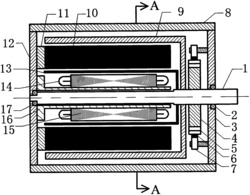 一种永磁式直流伺服测角加速度机组,主要包括转轴、电刷及支架、换向器、绝缘套筒、无槽转子、第一定子铁心、永磁磁钢、杯形转子、第二定子铁心、输出绕组、铜套、机壳和端盖。无槽转子绕组和铁心为固化一体式设计,绕组通过换向器与电刷相连;第一定子铁心置于无槽转子和杯形转子之间,且永磁磁钢固定在第一定子铁心的凹槽中;无槽转子和杯形转子同心地固定在转轴上;第二定子铁心置于杯形转子的内部,且输出绕组嵌放在第二定子铁心的绕组槽中。本发明的永磁式直流伺服测角加速度机组,伺服电动机和测角加速度装置共用同一磁场和转轴,具有结构紧凑、体积小、运行稳定等优点,且能够直接输出机组的旋转角加速度信息,测量精度高,抗干扰能力强。