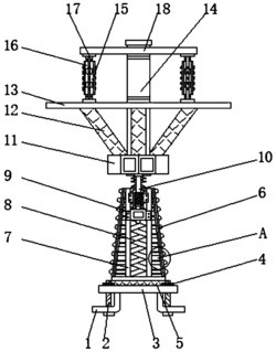 本发明公开了一种分裂导线支撑装置,包括预埋件、支撑板和延伸杆,所述预埋件的上方底端表面安装有固定螺栓,所述底座的上方贴合有橡胶圈,所述橡胶圈的上方安装有支柱,所述钢筋之间连接有加强筋,所述液压杆的上方固定有中间板,所述支撑板的上方设置有固定板,所述固定柱的左侧安置有第一法兰盘,所述第二法兰盘的外部表面贴合有防腐蚀层,所述支柱的上方安装有固定块。该导线支撑装置通过预埋件、固定螺栓、底座和螺母的设置,预埋件起到定位的作用,预埋件可以使支撑装置的后续安装更加便利,将预埋件通过固定螺栓和螺母与底座连接,从而稳定了支撑装置的底部结构,提升了底座的稳定性,防止了支撑装置发生抖动的情况。