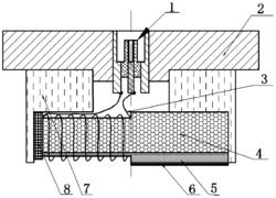 本发明公开了一种用于管道表面耦合的超磁致伸缩导波激励换能器,包括外壳顶盖、外壳底座和振动元件;振动元件形状为刀型,刀柄部分缠绕螺线管线圈,刀部与管道表面耦合,在长度方向上伸缩振动;换能器外壳顶盖中装有连接器,外壳底座中设有振动元件、背衬单元、永磁铁和匹配层;振动元件与匹配层采用环氧树脂胶粘结成一体;背衬单元与振动元件采用环氧树脂胶粘结成一体;螺线管线圈密绕于振动元件的刀柄部位和背衬单元之上;永磁体的一端固定于振动元件的刀柄部的一端端面;换能器内部有封闭磁回路。本发明的机电转换效率高,导波激励幅值大,且信噪比高,响应时间短,可以在管道任意位置进行实地检测,且具有吸收余震和增强声强透射率功能。