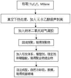 本发明属于视窗玻璃技术领域,并具体公开了一种抗磨耐高温的视窗玻璃的制备方法及制得的视窗玻璃,包括如下步骤:称取纳米片层Ti3C2Tx MXene,真空热处理后得到TiO2/Ti3C2Tx MXene复合物,并加入到乙醇中超声剥离,形成胶体溶液,将γ‑氨丙基三乙氧基硅烷溶于上述胶体溶液中,搅拌状态下加入纳米二氧化硅气凝胶超声分散,制得二氧化硅气凝胶/TiO2/Ti3C2Tx MXene纳米复合材料胶体溶液,加入甲基丙烯酸甲酯、α‑甲基苯乙烯,制得预聚物,并进一步制得视窗玻璃。本发明制得的视窗玻璃具有纳米级微粒骨架,而且直径范围分布极窄,具有良好的刚性与耐高温隔热性,耐划伤性能优异,而且抗冲击强度高,为在3D打印机视窗玻璃上的应用奠定了基础。