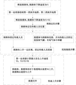 本发明具体涉及一种通过能力强、救援及时、可适应井内复杂环境的深井自动探测救援机器人及救援方法。所述的机器人包括探路体,探路体的通孔内穿过救援绳,救援绳上还挂设多个救援体,探路体的底端分别设置探路器、第一处理器,红外热成像仪、海拔高度计、摄像头、救援机构;救援体内设置无线路由器、第二处理器;探路体负责探路定位、现场施救,救援体负责现场辅助施救及快速上升,机器人体积紧凑,通过能力强;探路体的下降时绘制第一类深井地图、第二类深井地图有利于提高救援体、探路体的下降及上升速度;深井中有水时,探路体的轮毂电机保证其下降速度,救援体的电梯式升降驱动机构保证其下降速度,环境适应性强。