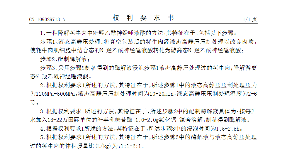 本发明公开了一种降解牦牛肉中N-羟乙酰神经唾液酸的方法,包括以下步骤:将真空包装后的牦牛肉经液态高静压压制处理以改良肉质,使牦牛肉肌细胞中结合态的N-羟乙酰神经唾液酸转化为游离态N-羟乙酰神经唾液酸;配制酶解液;采用酶解液浸泡液态高静压处理过的牦牛肉;降解得到N-羟乙酰神经唾液酸。该方法采用高静压技术、β-半乳糖苷酶技术和氯化钙共同作用,降解效果明显,加工成本低。