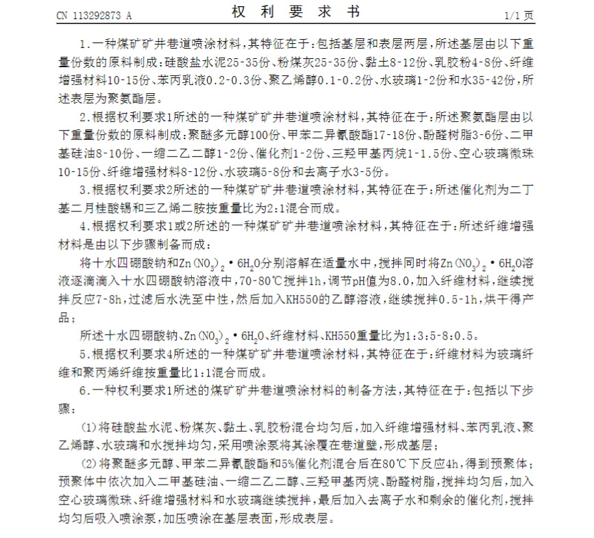 本发明公开一种煤矿矿井巷道喷涂材料,涉及矿井用新材料技术领域,包括基层和表层两层,所述基层由以下重量份数的原料制成:硅酸盐水泥25‑35份、粉煤灰25‑35份、黏土8‑12份、乳胶粉4‑8份、纤维增强材料10‑15份、苯丙乳液0.2‑0.3份、聚乙烯醇0.1‑0.2份、水玻璃1‑2份和水35‑42份,所述表层为聚氨酯层,支护性能优异,防腐蚀防泄漏,能进一步确保煤矿安全生产。