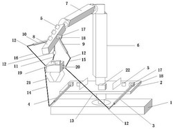 本发明设计一种主动控制恒张力的三连杆式船用自抓放机械臂装置。装置主要包括底座、平衡平台、左平衡臂、右平衡臂、张力传感器、连杆一、连杆二、连杆三、左辅助平衡臂、右辅助平衡臂、主吊索、左平衡索、右平衡索、左辅助平衡索、右辅助平衡索、视觉传感器、吊环、抓钩、PLC控制箱。采用四条平衡索,利用PLC实现主动控制恒张力,并采用视觉传感器的抓钩实现自动抓取收放功能。本发明优点在于使用多个自由度的三连杆式机械臂,扩大抓取范围。同时考虑海洋环境因素干扰力对主吊索、抓钩和被吊物影响。采用四条平衡索,提升减摇效果。运用视觉传感器,船用机械臂可以自动抓取收放被吊物,且相比于人工操作的船用起重机更加智能化,适用于多种运载器。