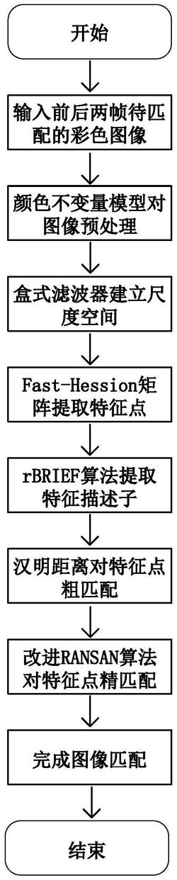 针对传统ORB算法因忽略图像颜色信息,对光照变化的鲁棒性较差,易造成误匹配的情况,本发明公开了一种融合颜色和尺度特征的ORB图像匹配方法。所述方法包括:首先使用颜色不变量模型对彩色图像进行预处理,求出图像的颜色不变量,以颜色不变量作为输入信息,建立积分图像,采用盒式滤波器建立尺度空间,使用快速Hession矩阵检测极值点,提取具有尺度不变性的特征点,然后使用rBRIEF算法得到特征描述符,最后采用汉明距离和改进RANSAC算法去除误匹配点。本发明在保证ORB算法特点的基础上,改善了ORB算法在颜色不同而对应灰度值相同区域正确匹配率低的问题,并且使算法具备尺度不变性,解决了特征点分布不均匀的情况,提高了图像发生尺度变化时匹配精度。