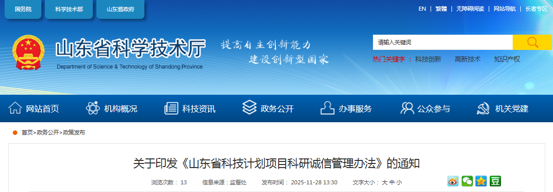 关于印发《山东省科技计划项目科研诚信管理办法》的通知(附政策解读)