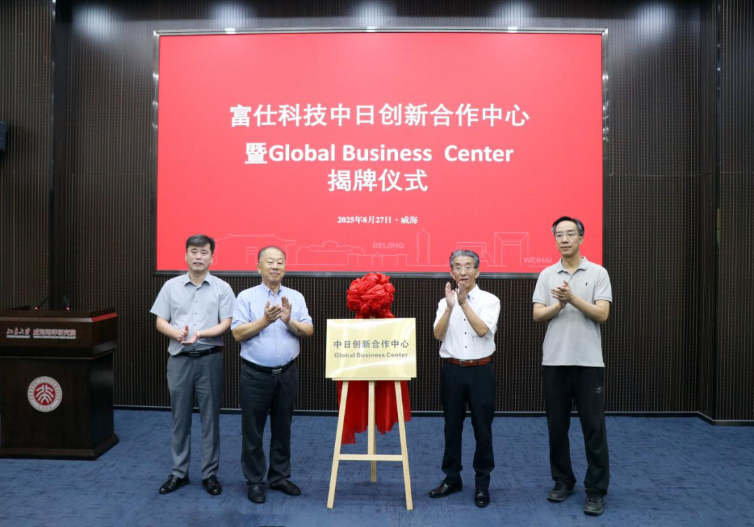 8月27日上午,富仕科技中日创新合作中心在北京大学威海海洋研究院揭牌成立。东京富士新集团董事长铃木宏,北京大学物理学院高级工程师刘顺荃,威海市科技成果转化促进会理事长、富仕科技发展(山东)有限公司董事长张锐参加揭牌,宇王集团董事长苗强受邀出席揭牌仪式并致辞。